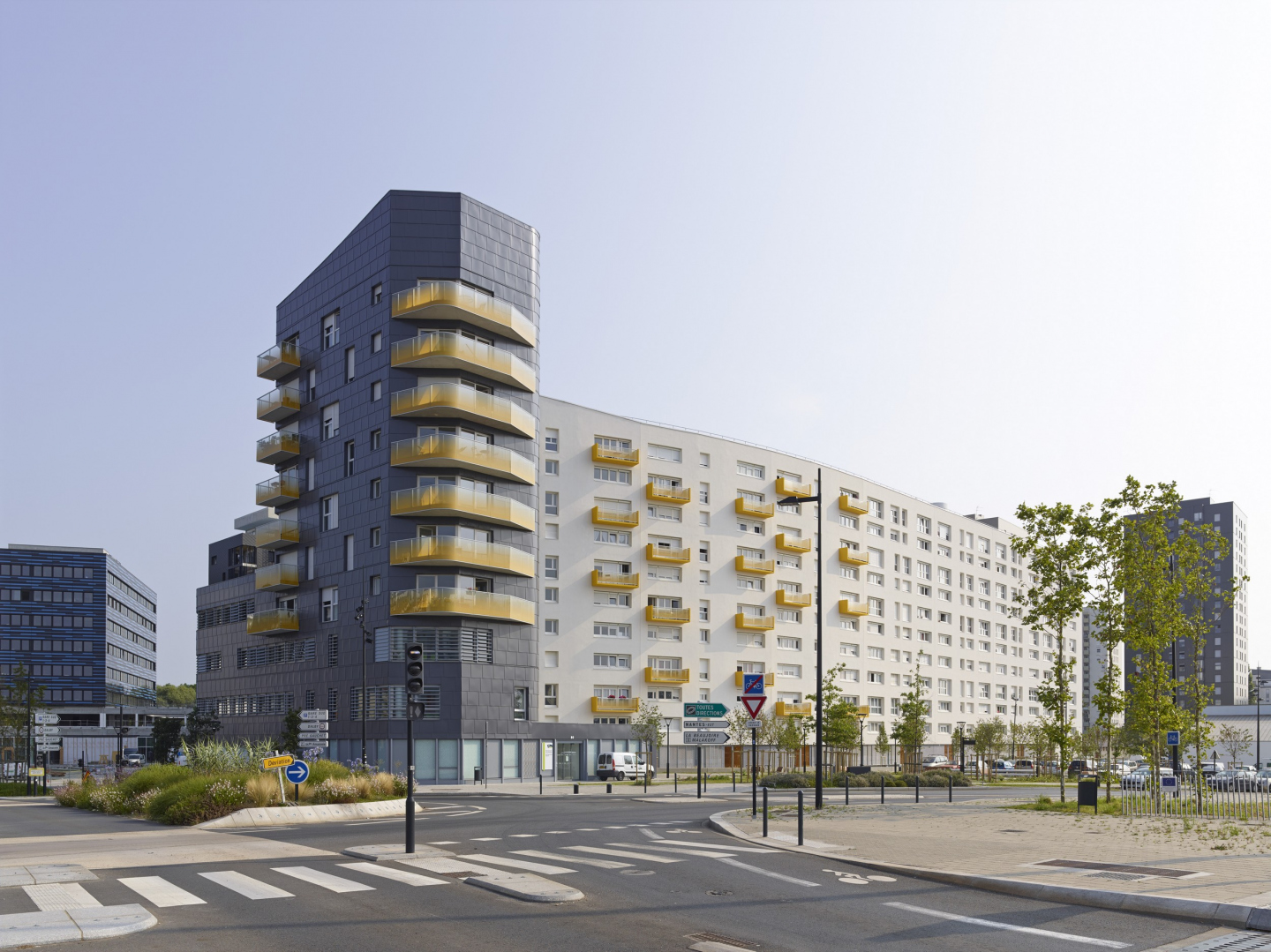 Le Linéaire d’Angleterre, pour sa réhabilitation, reçoit un enduit minéral blanc. Son pignon ouest est animé d’un rehaussement de sa ligne d’acrotère et de deux ouvertures créées et habillées de cadres saillants en acier laqué blanc et orangé. Les garde-corps des balcons existants de la façade Sud, sont remplacés par des vitrages teintés en dégradé jaune-orangé, à l’identique de ceux du Sémaphore. Celui-ci reçoit un bardage métallique de teinte grise qui contraste avec l’enduit clair du Linéaire. Les balcons similaires établissent le dialogue visuel entre les bâtiments. Cette relation entre les deux bâtiments basée sur le dialogue et le contraste génère la centralité souhaitée par l’Atelier Ruelle pour cette partie du quartier.